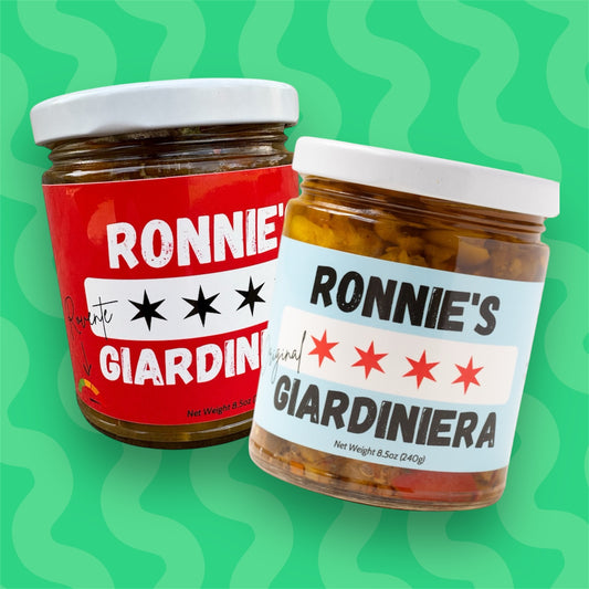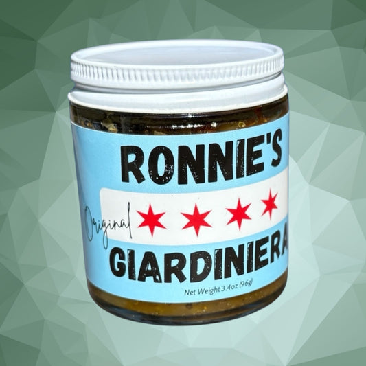 The best selling products from Ronnie's Giardiniera... Original & Rovente Giardiniera, BlackStraw Jam, Hats, Bags, Stickers, Chicago-Style Earrings and more!
