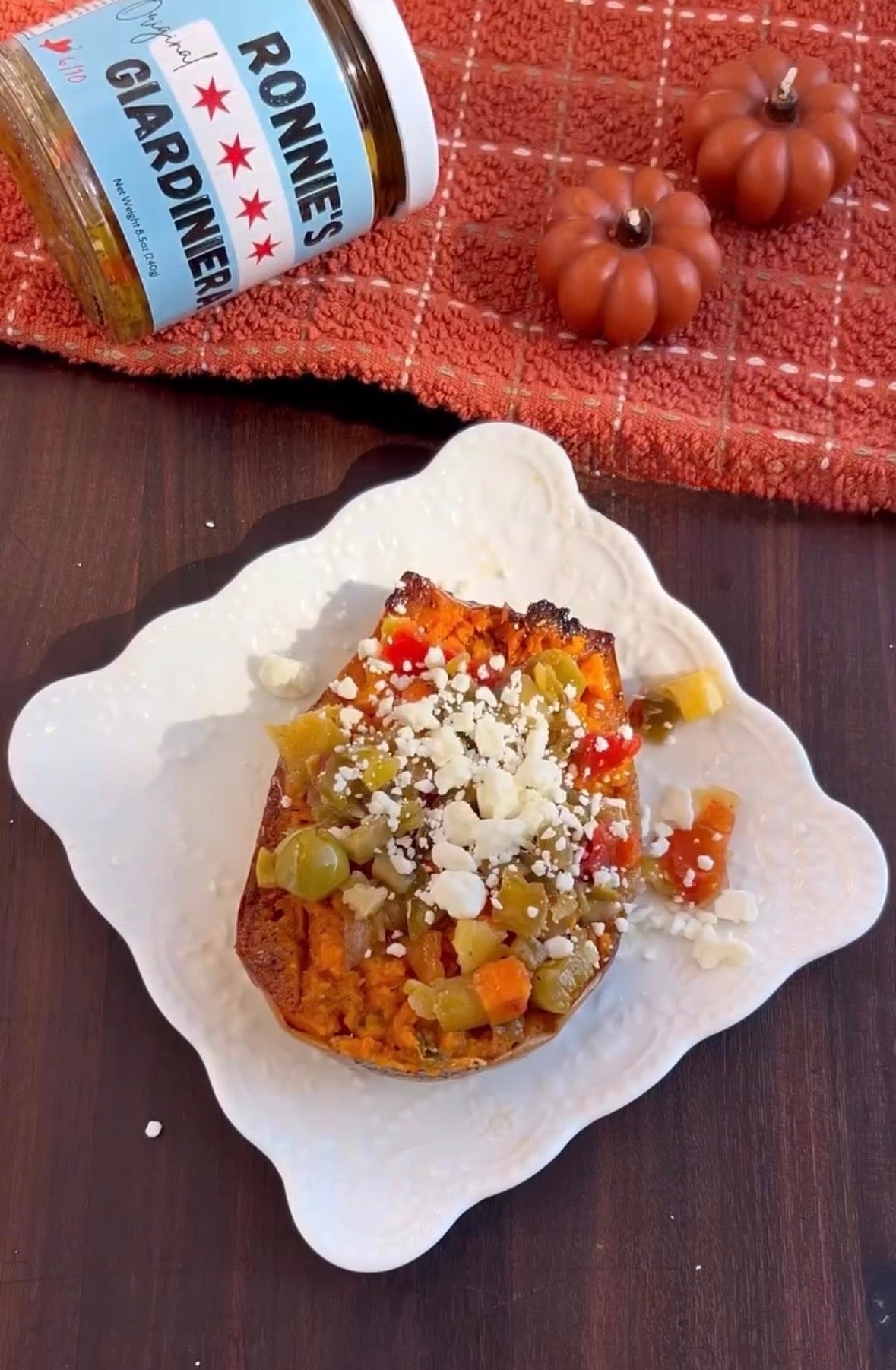 Cinnamon-Spice Butternut Squash with Ronnie’s Giardiniera and Feta brings a festive balance of warmth, sweetness, and gentle heat.Roasted until caramelized and golden, the tender butternut cubes are infused with cinnamon and a drizzle of Ronnie’s giardiniera oil, creating layers of spice and depth. Crumbled feta adds a creamy, tangy finish that perfectly complements the sweet-savory blend. It’s a cozy, colorful side dish that feels right at home on any holiday table. There are two recipe versions here; a full squash version as you see in the picture and in the Instagram video, then there is a cubed version.