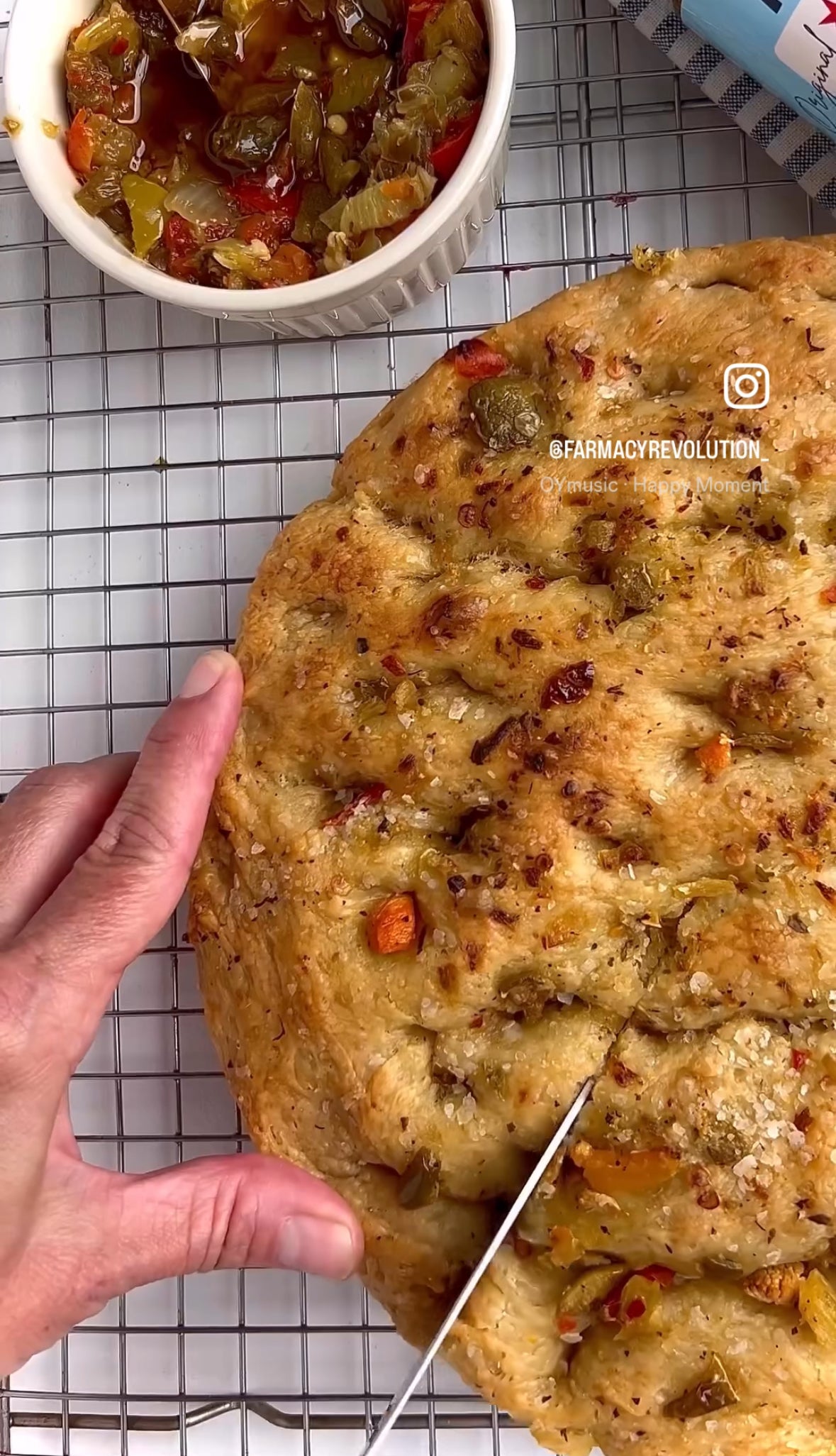 Ronnie's Giardiniera Focaccia Bread is where rustic Italian baking meets Chicago-style attitude. This golden, olive oil–brushed flatbread is soft on the inside, crisp on the outside, and generously topped with vibrant giardiniera—pickled peppers, carrots, cauliflower, and celery that bring a tangy, spicy crunch to every bite. The brine-kissed vegetables sink into the pillowy dough, infusing it with bursts of heat, vinegar, and herbs. Each square delivers the savory satisfaction of focaccia, with the bold punch of giardiniera baked right in. Perfect on its own, alongside soup, or sliced and used for sandwiches that don’t mess around. It's bread with backbone.