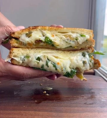 Mild, creamy Havarti melts into golden, buttery bread, cradling slices of juicy, ripe peaches that bring a soft sweetness to every bite. Just when you think it’s too delicate to be bold, Ronnie’s Giardiniera® crashes the party — crunchy, tangy, and laced with heat — cutting through the richness and balancing the fruit with a flash of fire and vinegar bite. Sweet. Spicy. Savory. Surprising. It’s the grilled cheese you didn’t know you were missing — until now.
