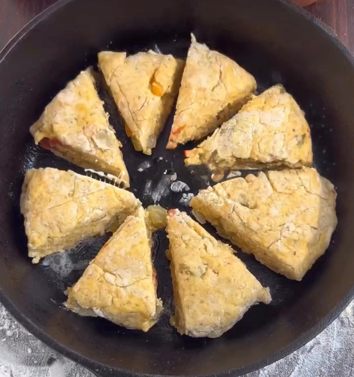 8. Brush warm scones with the honey butter right in the skillet so it melts and sizzles. Serve extra on the side for dipping.